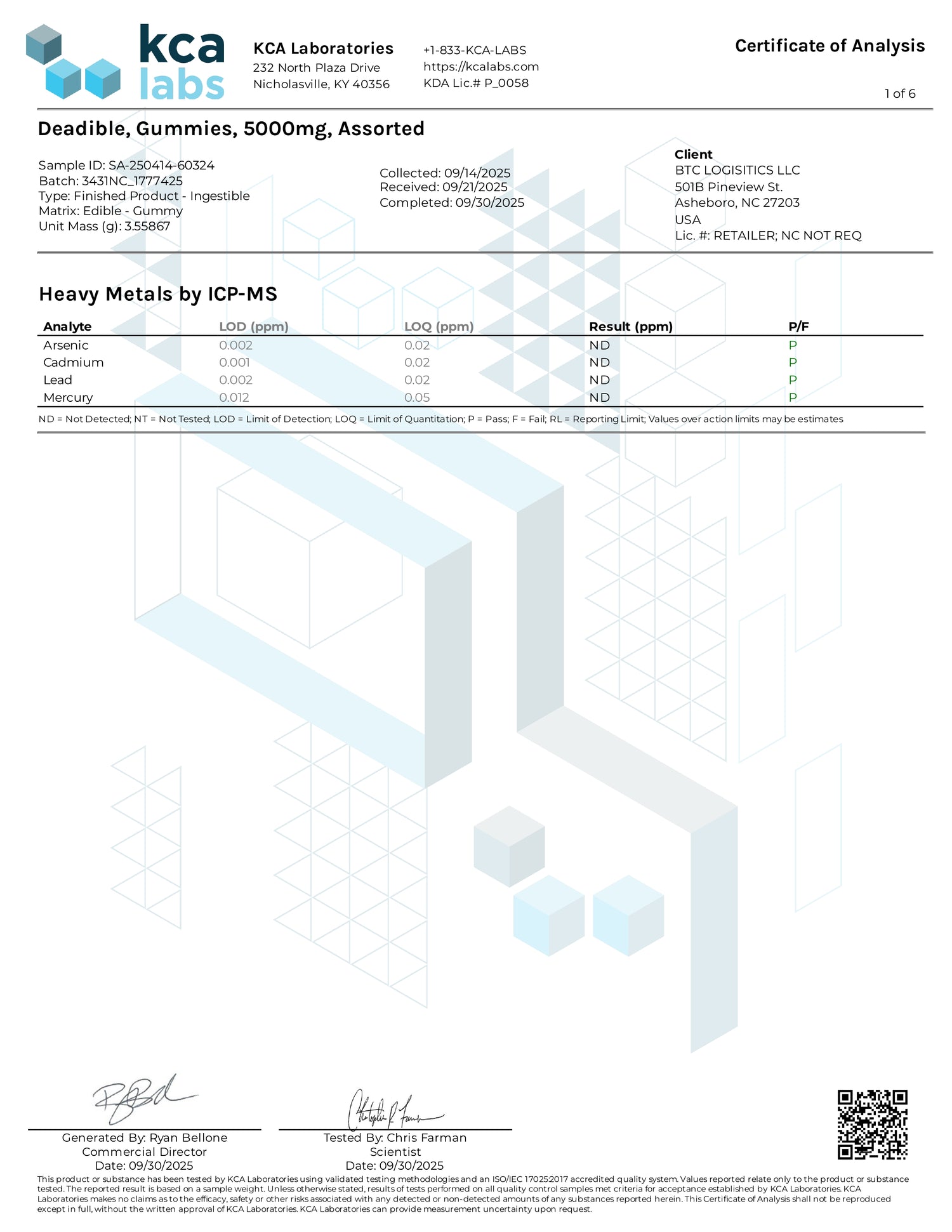 Heavy metals test via ICP-MS (inductively coupled plasma mass spectrometry) to detect and measure heavy metals in a sample with high sensitivity, detecting parts per million. This safety lab analysis reflects all 3 flavors dissolved and tested using . We complete multiple lab test with each and every bulk batch of gummies. We do this to ensure purity and overall top of the line quality control, with NO exceptions.