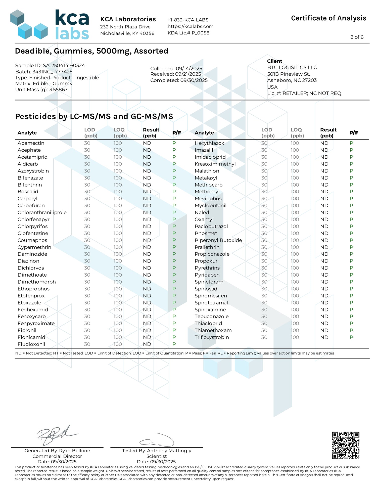 Pesticide test via (GC-MS/MS and LC-MS/MS, or GasChromatography-MassSpectrometry and Liquid Chromatography-Tandem Mass Spectrometry) GC-MS/MS uses a triple quadrupole system that offers higher selectivity and sensitivity for complex samples like pesticides in food. LC-MS/MS is an advanced analytical technique that combines liquid chromatography to separate components of a mixture with a tandem mass spectrometer to identify and quantify them with high sensitivity and selectivity.This safety lab analysis reflects all 3 flavors dissolved and tested using . We complete multiple lab test with each and every bulk batch of gummies. We do this to ensure purity and overall top of the line quality control, with NO exceptions.