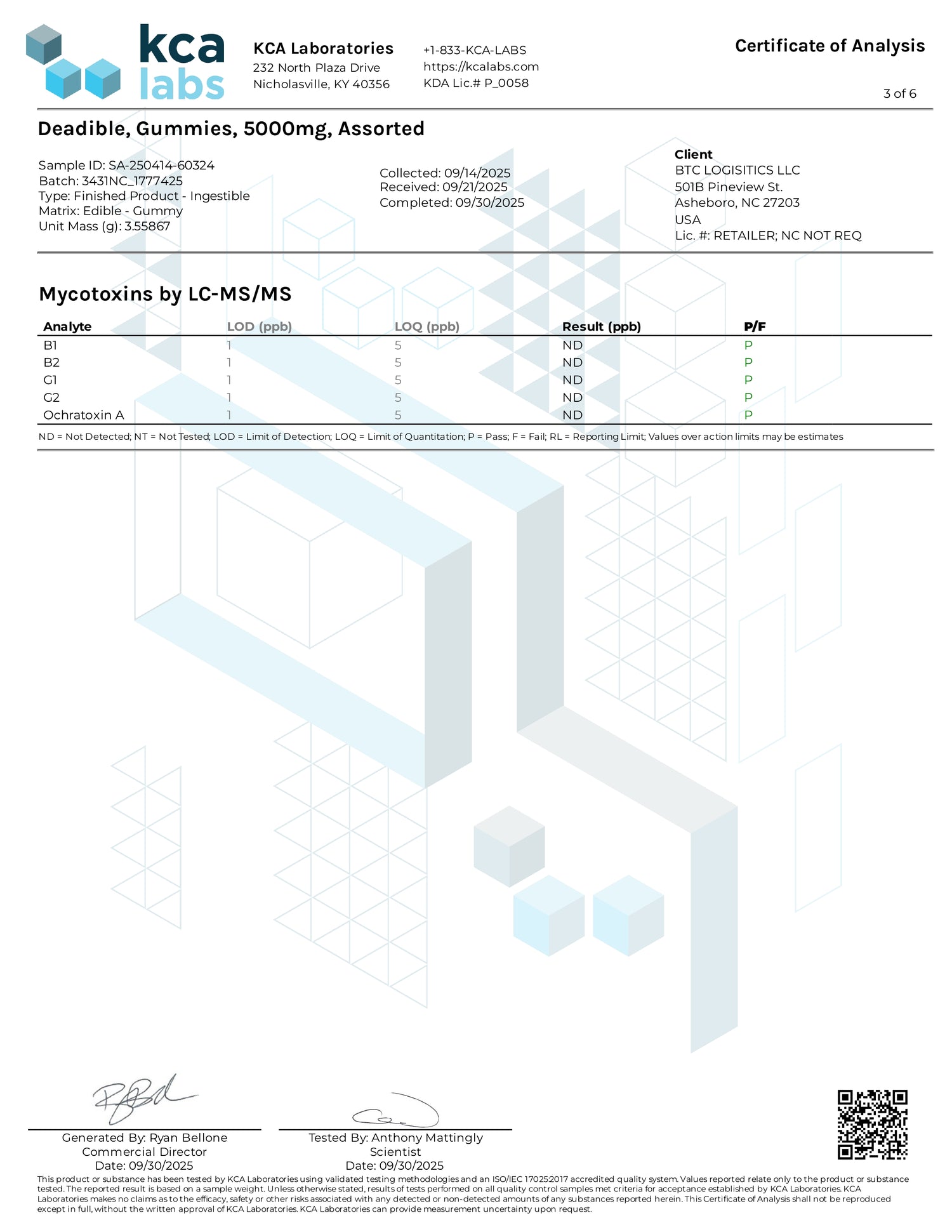 Mycotoxins test via Pesticide test via (LC-MS/MS, or Liquid Chromatography-Tandem Mass Spectrometry) an advanced analytical technique that combines liquid chromatography to separate components of a mixture with a tandem mass spectrometer to identify and quantify them with high sensitivity and selectivity. This safety lab analysis reflects all 3 flavors dissolved and tested using . We complete multiple lab test with each and every bulk batch of gummies. We do this to ensure purity and overall top of the line quality control, with NO exceptions.