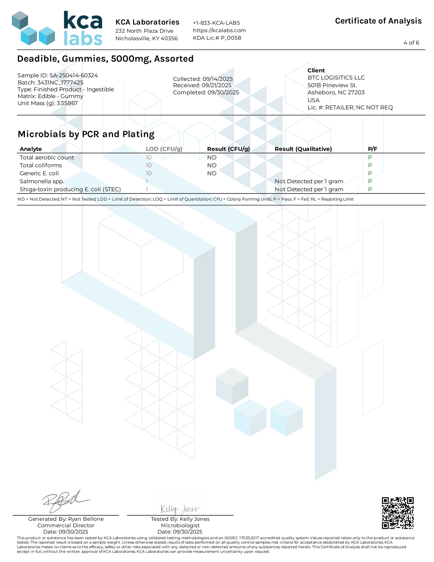 Microbials test via PCR and Plating (inductively coupled plasma mass spectrometry) As part of a PCR test, a small amount of genetic material in your sample is copied multiple times. Plating methods passively wait for cells to grow in a medium that is hopefully favorable to only the target microbes, growth equals a failed test. This safety lab analysis reflects all 3 flavors dissolved and tested using . We complete multiple lab test with each and every bulk batch of gummies. We do this to ensure purity and overall top of the line quality control, with NO exceptions.