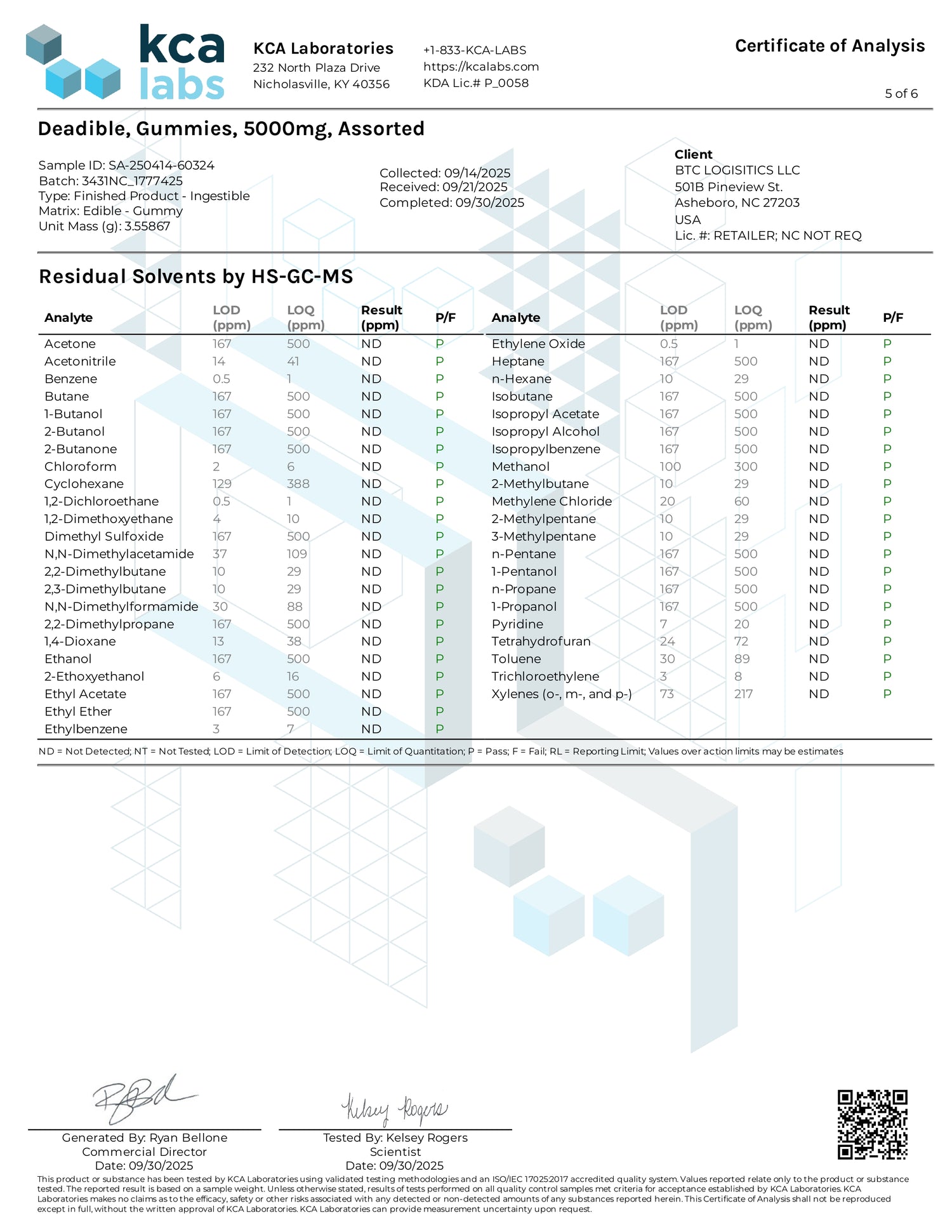 Residual Solvents test via (Headspace gas chromatography mass spectroscopy (HS-GC-MS) is the analysis of the volatile and semi-volatile organic compounds given off by a sample during heating or over time. This safety lab analysis reflects all 3 flavors dissolved and tested using . We complete multiple lab test with each and every bulk batch of gummies. We do this to ensure purity and overall top of the line quality control, with NO exceptions.
