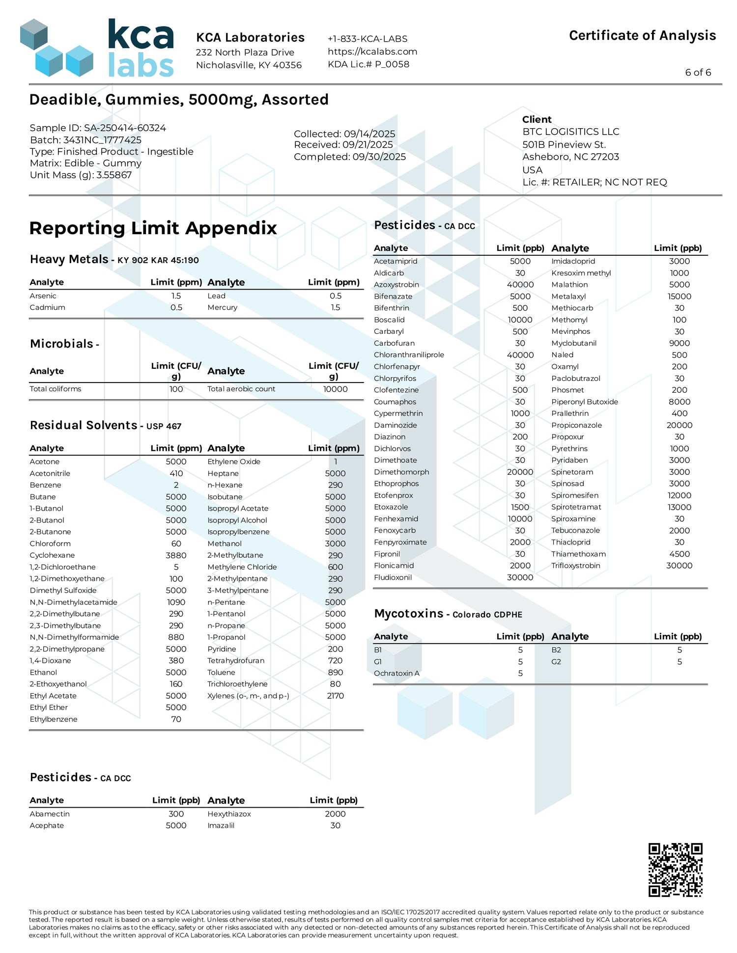 A Reporting Limit (RL or RDL) is the limit of detection for a specific target analyte for a specific sample after any adjustments have been made for dilutions or percent moisture. This safety lab analysis reflects all 3 flavors dissolved and tested using . We complete multiple lab test with each and every bulk batch of gummies. We do this to ensure purity and overall top of the line quality control, with NO exceptions.